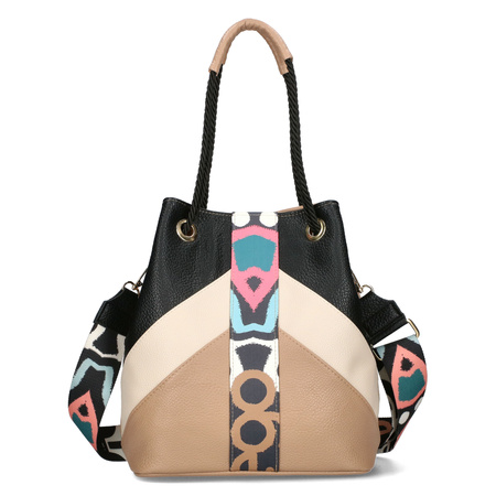 Wykonana z wysokiej jakości ekoskóry, torebka wyróżnia się modnym designem i funkcjonalnością. Ozdobne przeszycia oraz szeroki, odpinany pasek z wzorzystym nadrukiem dodają jej charakteru i nowoczesnego stylu.